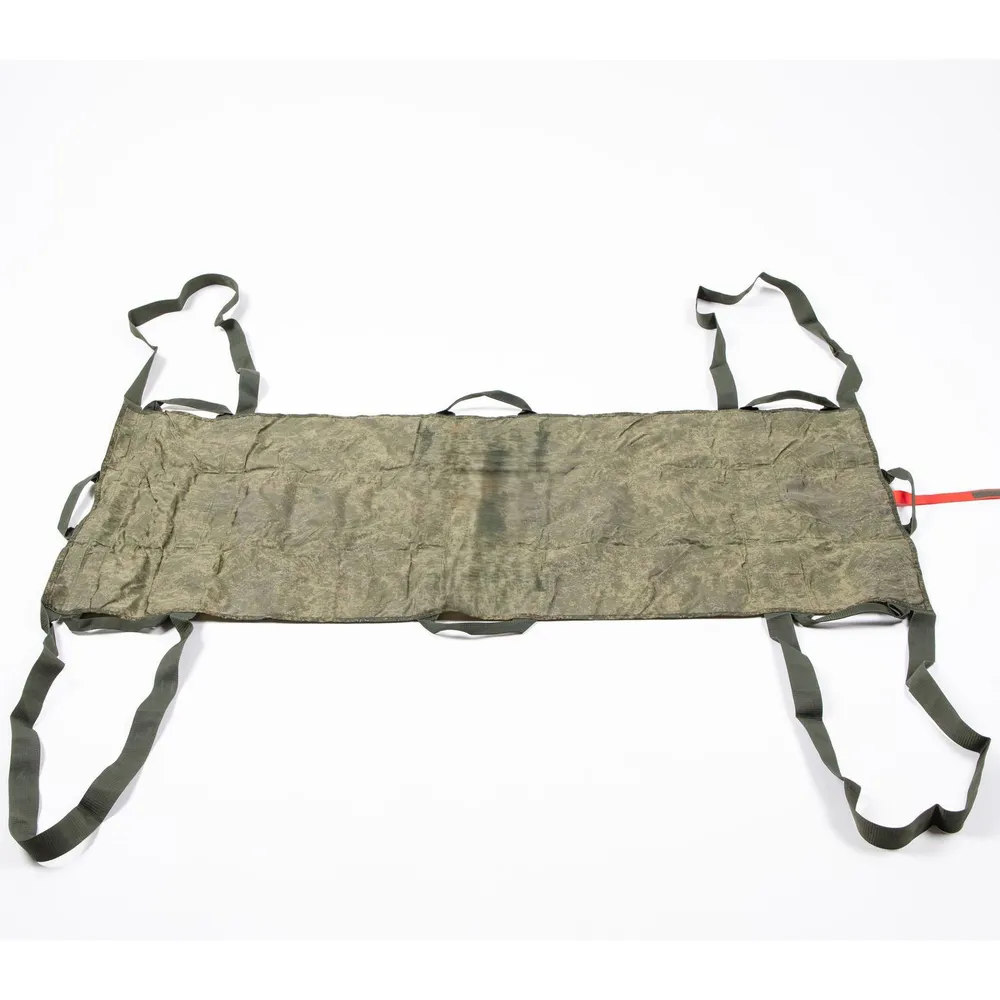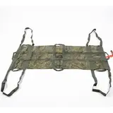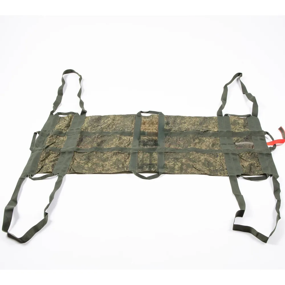 Назначение: Транспортировка раненого одновременно 6-ю бойцами. Военные носилки снабжены тремя парами ручек. Так же добавлена возможность переложить нагрузку на плечи, за счет увеличенных дублирующих ручек. При этом за счёт деформации материала под изгибы формы тела пациента достигается максимально возможный в экстремальных условиях комфорт для раненого.