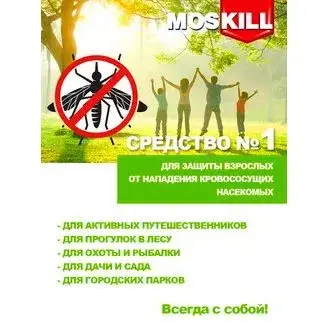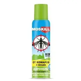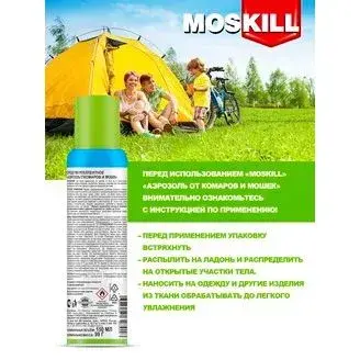 Аэрозоль от насекомых Москилл от комаров мошек и других насекомых 150мл предназначен для защиты взрослых и детей страше 5 лет от кровососущих насекомых (комаров, мокрецов, москитов, мошек, слепней, блох) при нанесении на открытые части тела, одежду и другие изделия из ткани. Перед применением упаковку встряхнуть. Средство распылить на ладонь и аккуратно равномерно распределить на открытые части тела (лицо, руки, шею, ноги), не втирая. Одежду и другие изделия из ткани обрабатывать до легкого увлажнения на открытом воздухе. Располагать одежду и направлять струю по направлению ветра. Средство распылять на изделия с расстояния 20 – 25 см от них, держа упаковку в вытянутой руке. Время защитного действия от насекомых: при нанесении на кожу – до 3 часов, при нанесении на одежду и другие изделия из ткани – до 15 суток. Для увеличения длительности защитного действия обработанную одежду хранить в закрытом полиэтиленовом пакете.