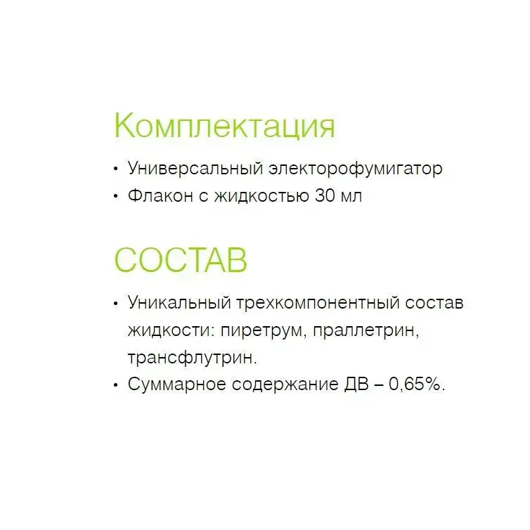 | Состав | Натуральные пиретрины (0,025%),трансфлутрин (0,1%), праллетрин (0,5%), растворитель |
