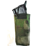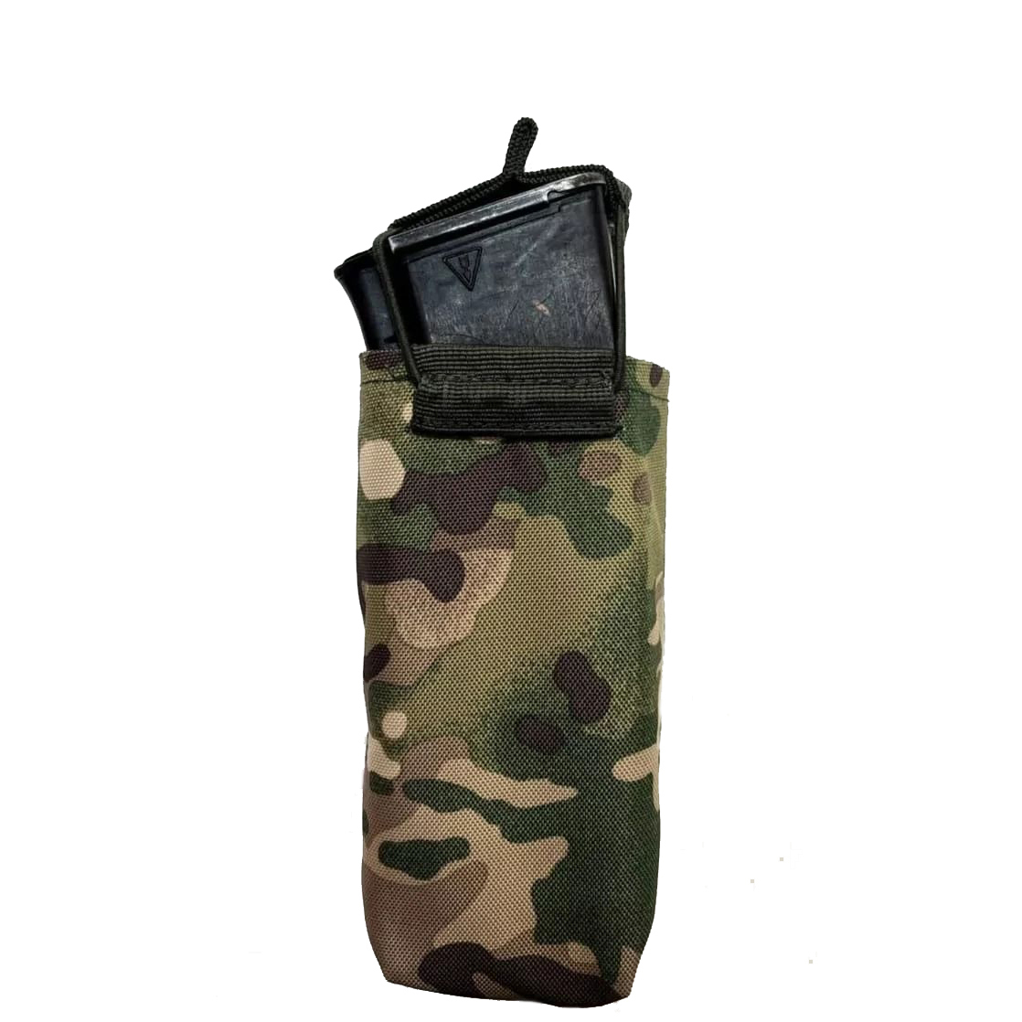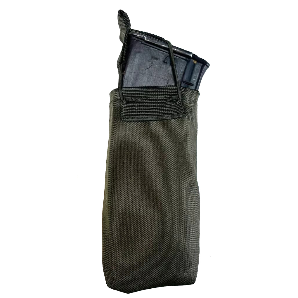 Крепление магазинов в открытом подсумке осуществляется системой резинок и стропой-бабочкой. Преимуществом открытых подсумков является бесшумность и быстрота доступа к магазинам.