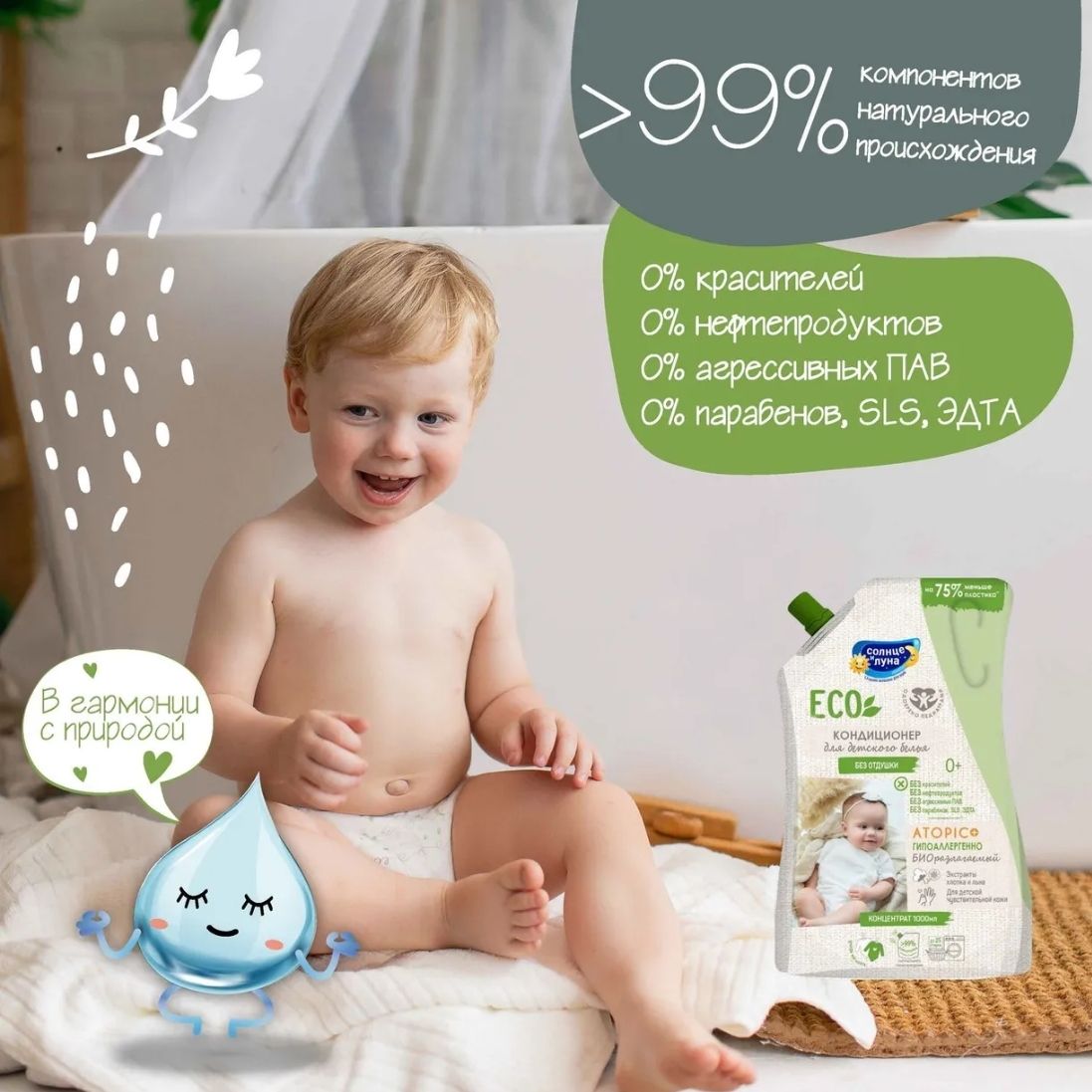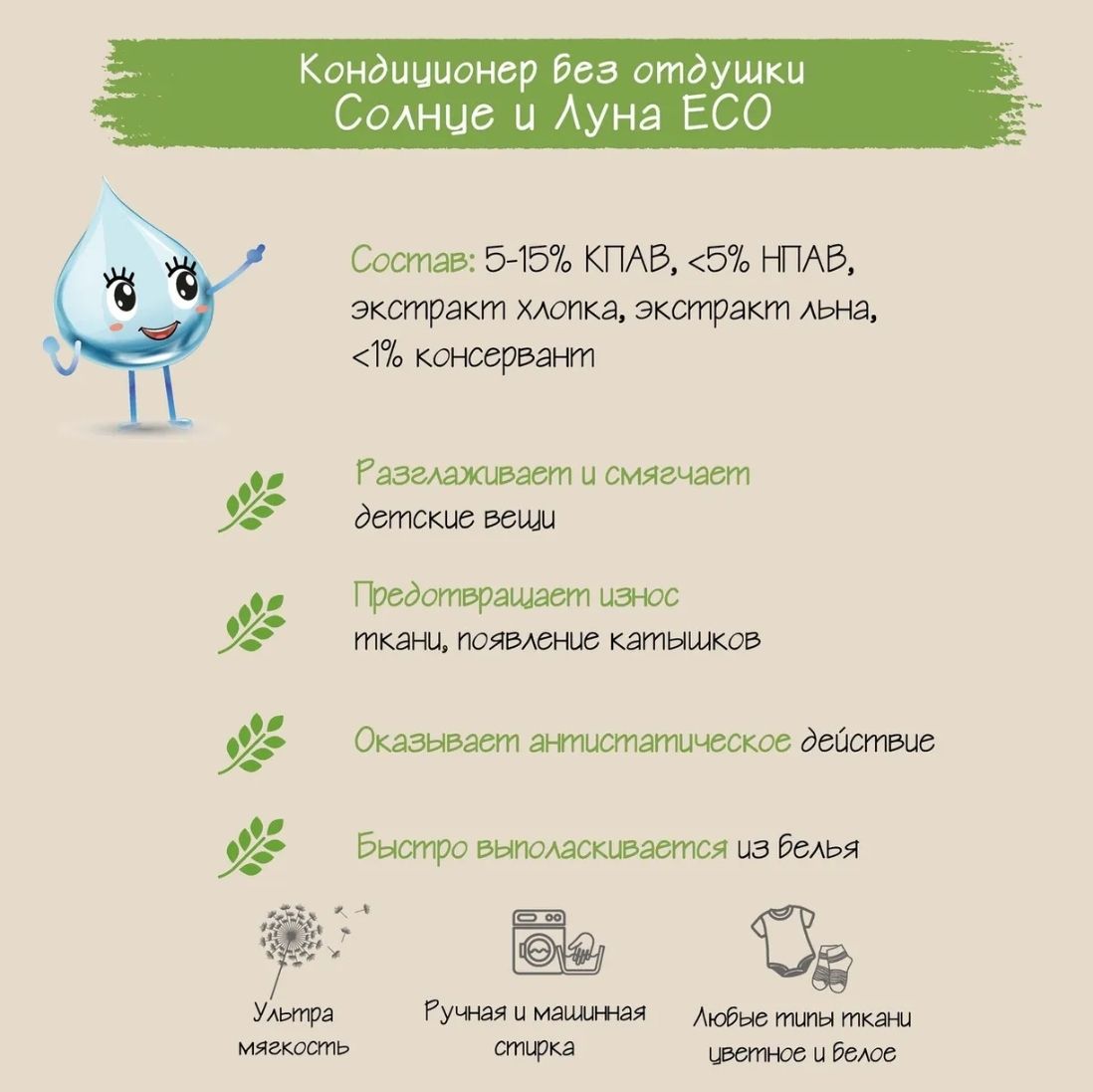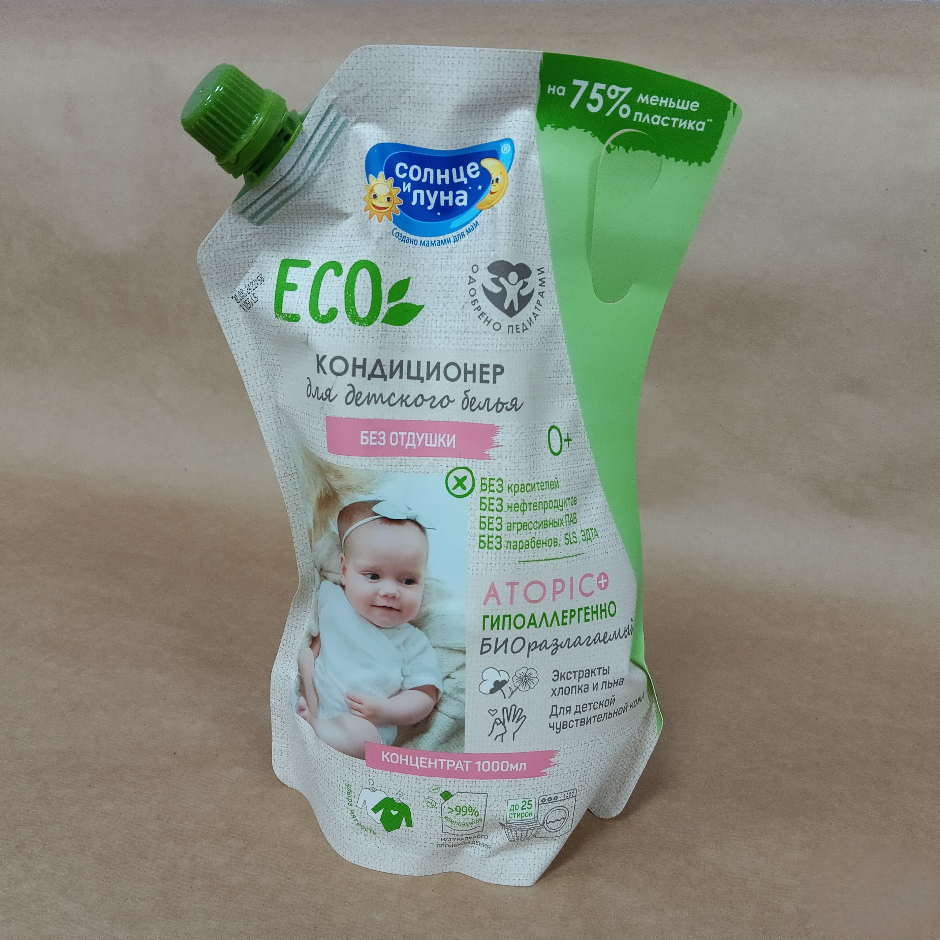 **СОЛНЦЕ И ЛУНА ECO Кондиционер для детского белья БЕЗ ОТДУШКИ дой-пак 1000 мл** Кондиционер для детского белья «Солнце и луна» — это незаменимое средство для бережного ухода за одеждой вашего малыша. Он помогает сохранить цвет и форму вещей, делая их мягкими и приятными на ощупь. Благодаря инновационной формуле с натуральными компонентами кондиционер не только эффективно справляется со своей задачей, но и заботится о здоровье вашего ребёнка. Средство не содержит отдушек и красителей, что делает его идеальным выбором для самых маленьких членов семьи. Кондиционер подходит для всех типов тканей и может использоваться как при ручной, так и при машинной стирке. Удобная упаковка дой-пак обеспечивает простоту использования и хранения средства. Объём в 1000 миллилитров позволит вам надолго забыть о покупке нового кондиционера, обеспечивая вашему ребёнку комфорт и заботу на протяжении длительного времени. Сделайте правильный выбор для своего малыша — выберите кондиционер для детского белья «Солнце и Луна»! **Особенности:** * Бережно ухаживает за тканью, сохраняя её цвет и форму. * Делает бельё мягким и приятным на ощупь. * Не содержит отдушки и красители. * Подходит для ручной и машинной стирки. * Удобный формат упаковки дой-пак. * Объём: 1000 мл. С кондиционером для детского белья «Солнце и Луна» вы можете быть уверены в безопасности и качестве ухода за вещами вашего ребёнка!