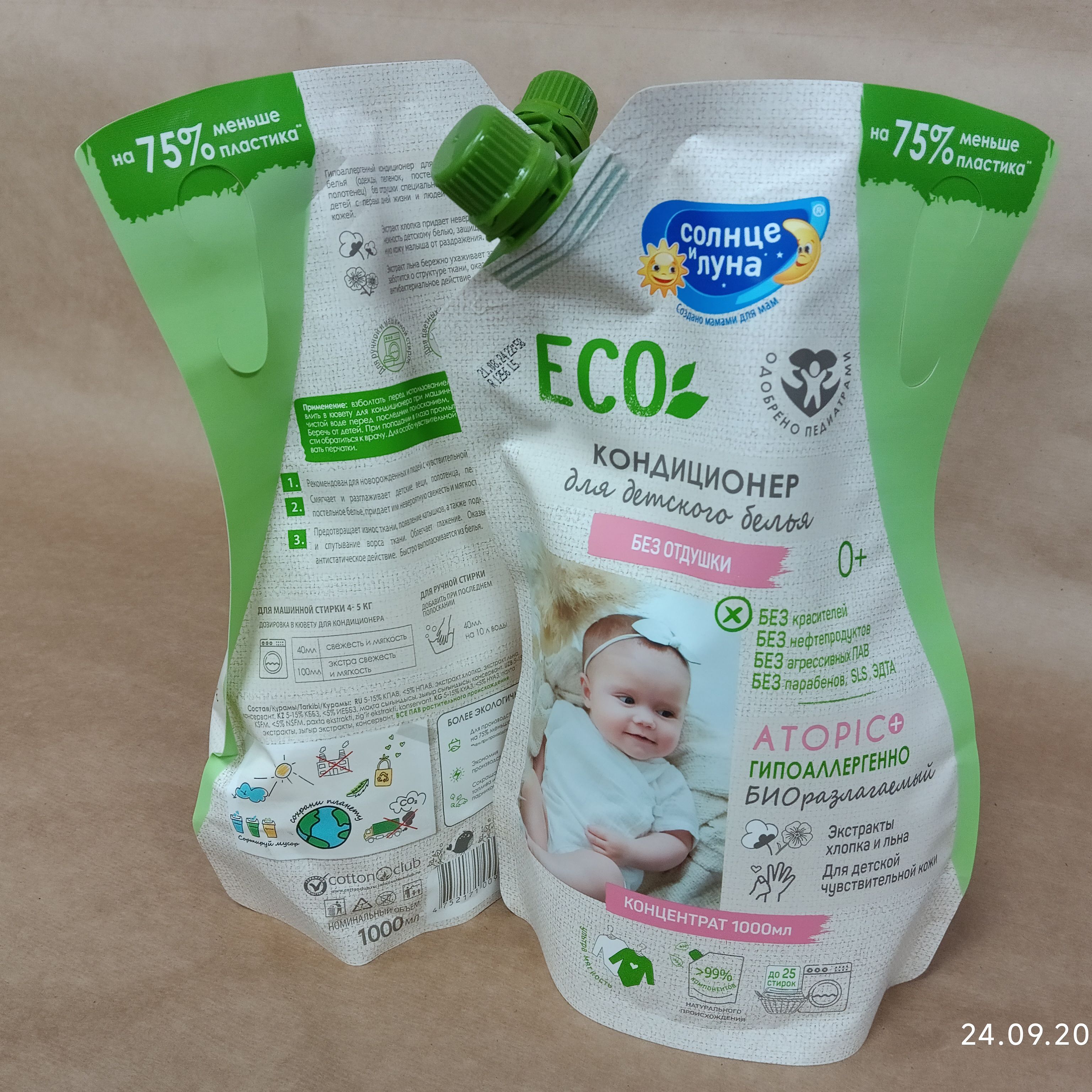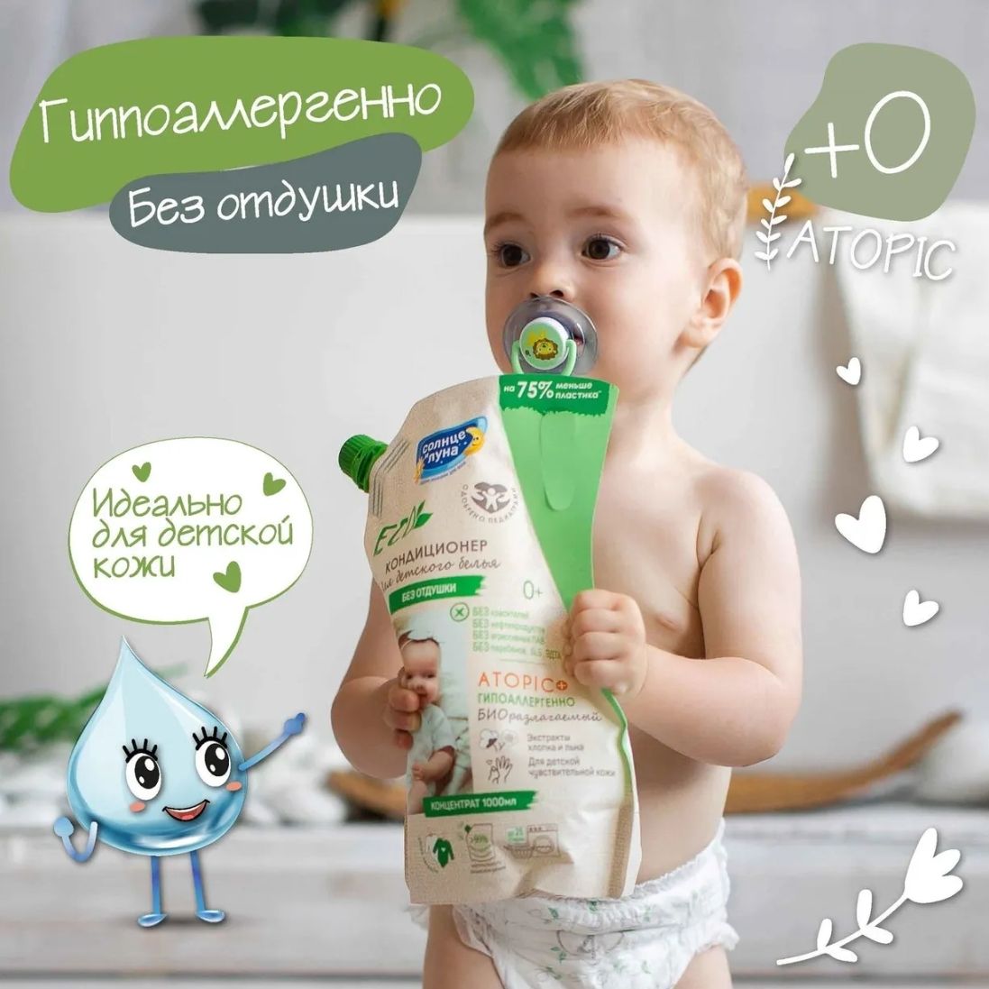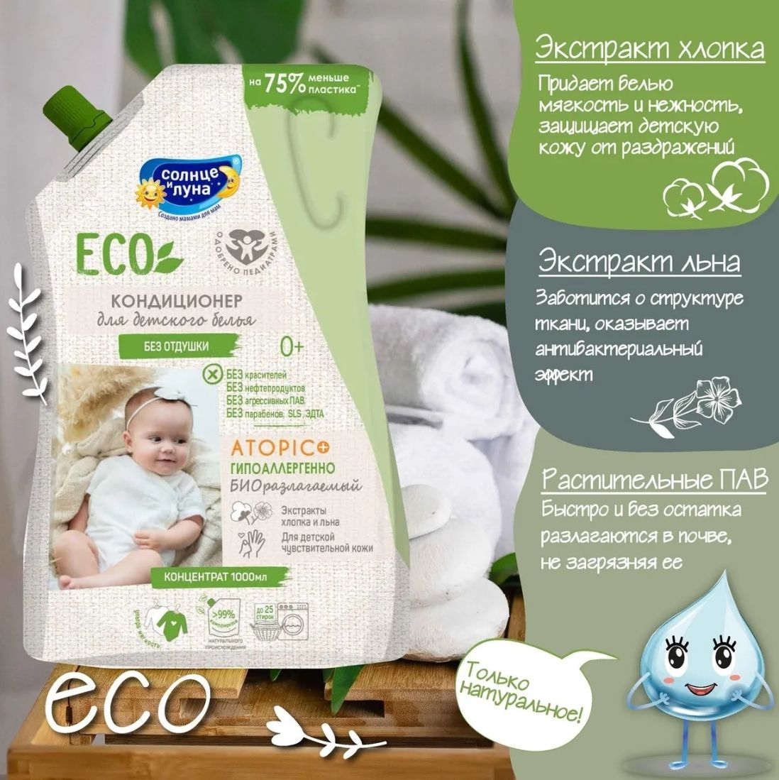 **СОЛНЦЕ И ЛУНА ECO Кондиционер для детского белья БЕЗ ОТДУШКИ дой-пак 1000 мл** Кондиционер для детского белья «Солнце и луна» — это незаменимое средство для бережного ухода за одеждой вашего малыша. Он помогает сохранить цвет и форму вещей, делая их мягкими и приятными на ощупь. Благодаря инновационной формуле с натуральными компонентами кондиционер не только эффективно справляется со своей задачей, но и заботится о здоровье вашего ребёнка. Средство не содержит отдушек и красителей, что делает его идеальным выбором для самых маленьких членов семьи. Кондиционер подходит для всех типов тканей и может использоваться как при ручной, так и при машинной стирке. Удобная упаковка дой-пак обеспечивает простоту использования и хранения средства. Объём в 1000 миллилитров позволит вам надолго забыть о покупке нового кондиционера, обеспечивая вашему ребёнку комфорт и заботу на протяжении длительного времени. Сделайте правильный выбор для своего малыша — выберите кондиционер для детского белья «Солнце и Луна»! **Особенности:** * Бережно ухаживает за тканью, сохраняя её цвет и форму. * Делает бельё мягким и приятным на ощупь. * Не содержит отдушки и красители. * Подходит для ручной и машинной стирки. * Удобный формат упаковки дой-пак. * Объём: 1000 мл. С кондиционером для детского белья «Солнце и Луна» вы можете быть уверены в безопасности и качестве ухода за вещами вашего ребёнка!