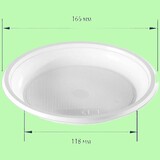 Тарелка пластиковая диаметром 165 мм производства компании "Мистерия". Предназначена для фасовки блюд горячего и холодного стола, выпечки, кондитерских изделий. Изготовлена из полистирола (ПС), поэтому, несмотря на то, что тарелка подходит для горячих блюд, разогрев изделия в микроволновой печи не допускается. Тарелка имеет единую секцию, внешний диаметр 165 мм, цвет исполнения - белый. Произведена в России.