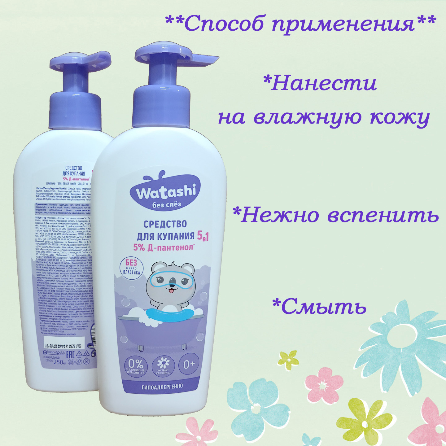 **WATASHI Детское средство для купания 5в1 0+** — это универсальное средство, которое объединяет в себе пять функций: шампунь, гель для душа, пену для ванны, средство для ухода за кожей и средство для стирки.Средство разработано специально для детей с первых дней жизни и учитывает особенности детской кожи. Оно бережно очищает волосы и кожу малыша, не вызывая раздражения и сухости. Формула средства содержит натуральные компоненты, которые увлажняют и питают кожу, делая её мягкой и гладкой.**Преимущества WATASHI:*** **Универсальность.** Средство выполняет сразу несколько функций, что позволяет сэкономить место на полке и время на выбор нужного продукта.* **Безопасность.** Средство не содержит вредных химических компонентов, таких как парабены, силиконы и красители.* **Эффективность.** Средство мягко очищает волосы и кожу ребёнка, обеспечивая чистоту и свежесть.* **Увлажнение и питание.** Формула средства обогащена натуральными компонентами, такими как экстракты ромашки и календулы, которые ухаживают за кожей малыша.* **Экономичность.** Благодаря высокой концентрации активных веществ, средство расходуется экономично.WATASHI — это идеальный выбор для родителей, которые хотят обеспечить своему ребёнку максимальный комфорт и безопасность. Средство подходит для ежедневного использования и может быть использовано как для купания, так и для стирки детских вещей.