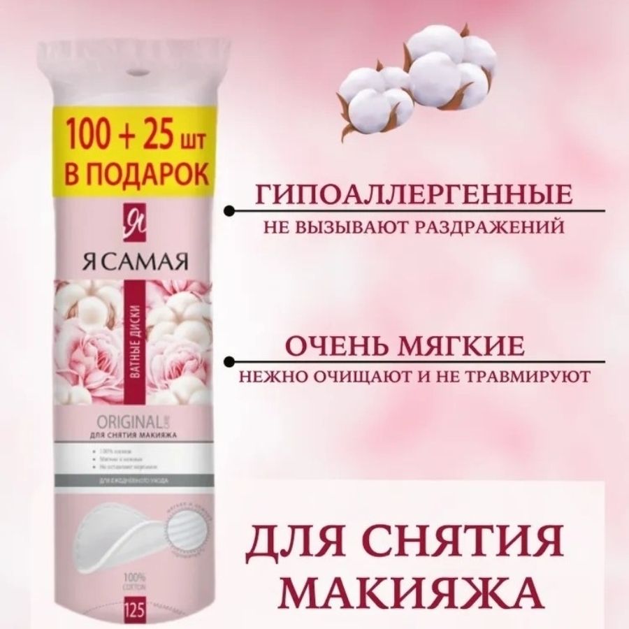 Мягкие и нежные ватные диски ТМ "Я Самая" деликатно очищают кожу в зоне декольте, шеи, лица, рук. Прекрасно подходят для любых косметически процедур.